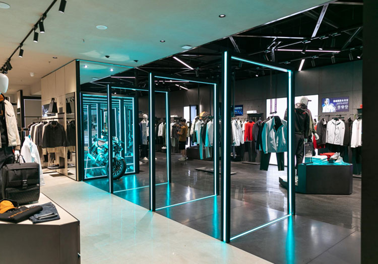 店內(nèi)先鋒產(chǎn)品聚勢集結(jié),在夾克旋轉(zhuǎn)展臺、功能互動展臺結(jié)合呈現(xiàn)。以中國首家