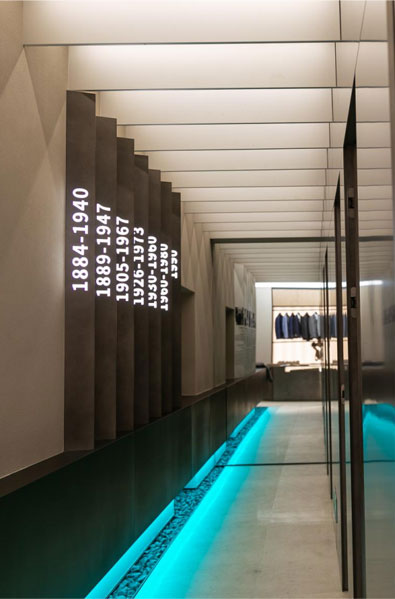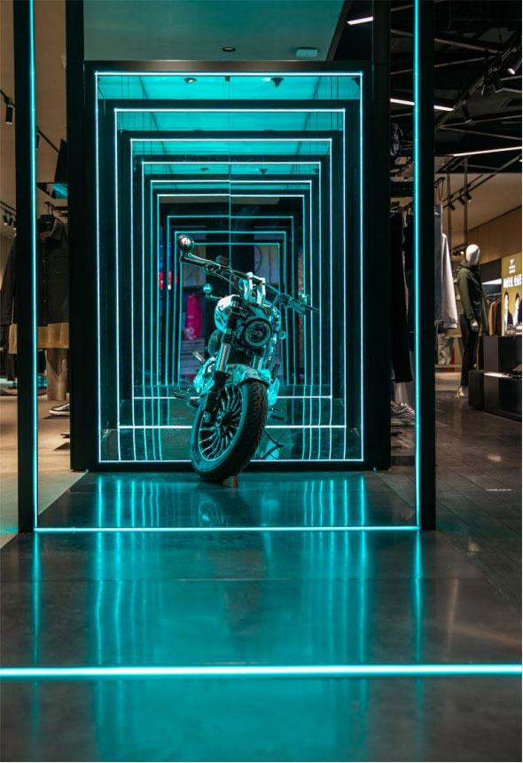占地面積500多平方米的雙面空間中,時空隧道在灰色地磚與黑色地板交界處,延伸哈雷機車馳騁于錯落的燈帶框架間,實現(xiàn)一場復古與現(xiàn)代的時空轉(zhuǎn)換,兼具現(xiàn)代創(chuàng)新的硬朗線條劃分區(qū)域空間的錯落光影徹底踐行l(wèi)uca?dicesare簡約先鋒的設計理念